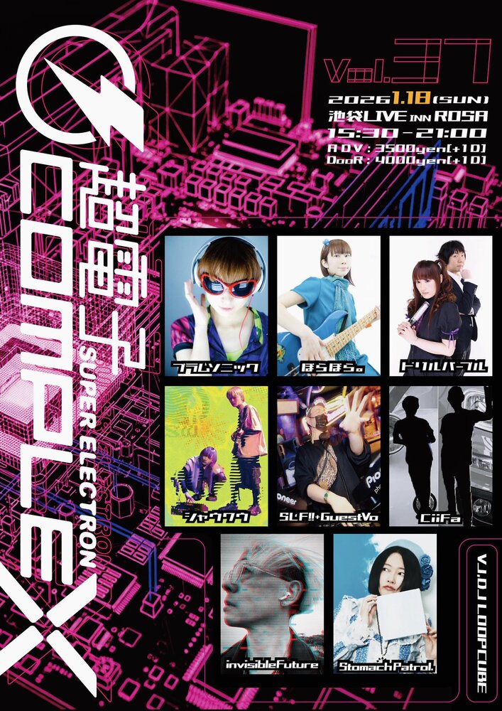 超電子COMPLEX Vol.37 SCHEDULE 2026/01/18(日) 2026.1.18(日)超電子COMPLEX Vol.37池袋LIVE INN ROSA15:30-21:00 プラムソニック ぽらぽら。ドリルパープルSLF!!(GuestVo.)CiiFainvisibleFuturestomach patrol.LOOPCUBEシャウワウ ご予約はこちらから URLをコピーする 報告する